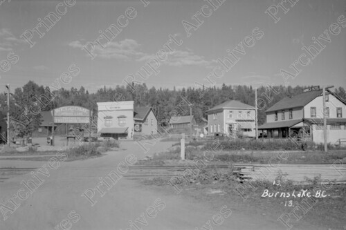 Scope & Content: Item consists of a view of Burns Lake including a street near CN Railway tracks, buildings, trees, a pedestrian, vehicles, the office of Thomas P. Smith, the Omineca Hotel and the Royal Bank of Canada. Handwritten annotation on recto of copy 1 and 3 reads: "13. Burns Lake, B.C. 13." Handwritten annotation on recto of copy 3 reads: "1948." Stamped annotation on verso of copy 3 reads: "Photo by Jack Wrathall Prince Rupert, B. C."
