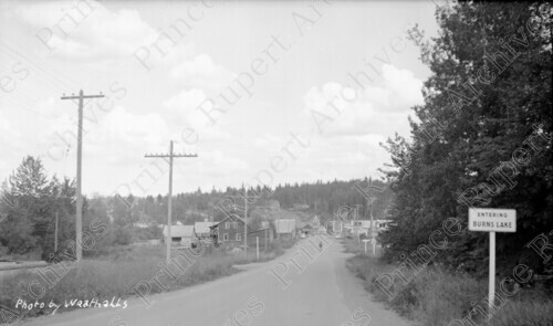 Scope & Content: Item consists of a view of Burns Lake including two people walking down a road leading to the main highway, service station, buildings and homes. A sign reading "Entering Burns Lake" can be seen on the right. Handwritten annotation on recto of copies 1, 2 and 3 reads: "Photo by Wrathalls [sic]." Handwritten annotation on recto of copy 3 reads: "Burs [sic] Lake, B.C. 1948." Stamped annotation on verso of copies 2 and 3 reads: "Photo by Jack Wrathall Prince Rupert, B. C."