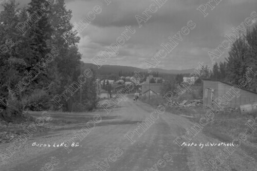 Scope & Content: Item consists of a view of Burns Lake including houses and other buildings, a dirt road running through the town and parked vehicles. Handwritten annotation on recto of copies 1, 2 and 3 reads: "Burns Lake B.C. Photo by J. Wrathall." Handwritten annotation on recto of copy 3 reads: "1948." Stamped annotation on verso of copy 3 reads: "Photo by Jack Wrathall Prince Rupert, B. C."