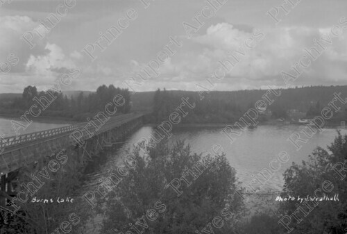 Scope & Content: Item consists of a view of Burns Lake including a wooden bridge. A seaplane and houses can be seen on the right. Handwritten annotation on recto of copies 1, 2, 3 and 4 reads: "Burns Lake. Photo by J. Wrathall." Stamped annotation on verso of copy 3 reads: "Photo by Jack Wrathall." Handwritten annotation on recto of copies 3 and 4 reads: "1948."