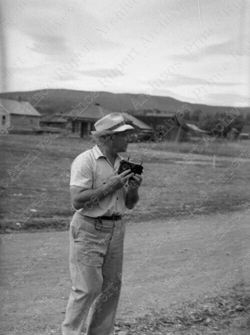 Scope & Content: Item consists of Jeff Woodall holding a camera and standing on the road at Burns Lake BC during the Burns Lake Barbecue. Woodalll worked for the CNR. Handwritten annotation on recto of copy 2 reads: "Jeff Woodall. Burns Lake, B.C. C.N.R. Man. 1945." Stamped annotation on verso of copy 2 reads: "Photo by Jack Wrathall Prince Rupert, B. C."