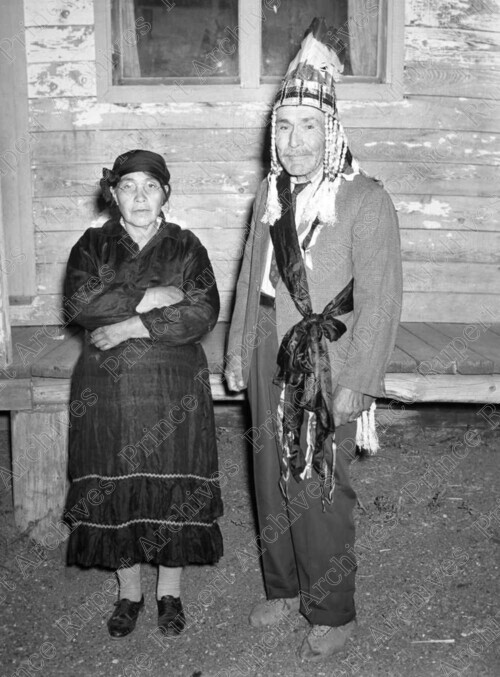 Scope & Content: Item consists of Captain and Chief Leon Prince, wearing a headdress, and his wife standing in front of a wooden building at Fort St. James.