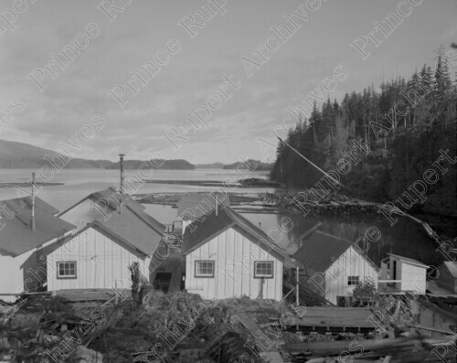 Scope & Content: Photograph depicts buildings, log booms, and equipment at Kelly Logging Co. camp at Shannon Bay on Haida Gwaii. Handwritten annotation on recto of copy 2 reads: "Kelly Logging Co. At Shannon Bay. Q. Ch. Isl. 1950." Stamped annotation on verso of copy 2 reads: "Photo by Jack Wrathall Prince Rupert, B. C."