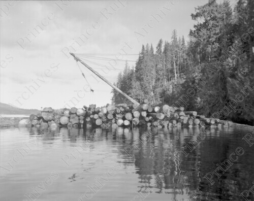 Scope & Content: Photograph depicts logs piled at the water's edge at Kelly Logging Co. camp with a crane in the background at Shannon Bay on Haida Gwaii. Handwritten annotation on recto of copy 2 reads: "Kelly Logging Co. Shannon Bay. Q. Ch. Isl. 1950." Stamped annotation on verso of copy 2 reads: "Photo by Jack Wrathall Prince Rupert, B. C."