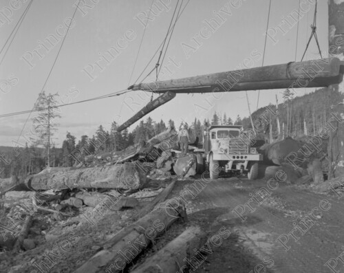 Scope & Content: Item consists of a logging truck, cranes lifting logs and workers at Kelly Logging Co. site at Juskatla on Haida Gwaii. Handwritten annotation on recto of copy 2 reads: "Kelly Logging Co. Juskatla. Q. Ch. Isl. 1950." Stamped annotation on verso of copies 2 and 3 reads: "Photo by Jack Wrathall Prince Rupert, B. C." Handwritten annotation on verso of copy 3 reads: "Printed Backwards."