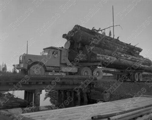 Scope & Content: Item consists of a Kelly Logging Co. driver waiting on a wharf with truck ready to unload logs at Juskatla on Haida Gwaii. Handwritten annotation on recto of copy 2 reads: "Kelly Logging Co. Ready to Dump Logs. Juskatla. Q. Ch. Isl. 1950." Stamped annotation on verso of copy 2 reads: "Photo by Jack Wrathall Prince Rupert, B. C."