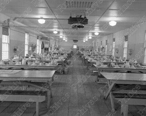 Scope & Content: Item consists of tables with food and dishes in the Kelly Logging Co. mess hall at Juskatla on Haida Gwaii. Handwritten annotation on recto of copy 2 reads: "Kelly Logging Co. Mess Hall. Juskatla. Q. Ch. Isl. 1950." Stamped annotation on verso of copy 2 reads: "Photo by Jack Wrathall Prince Rupert, B. C."