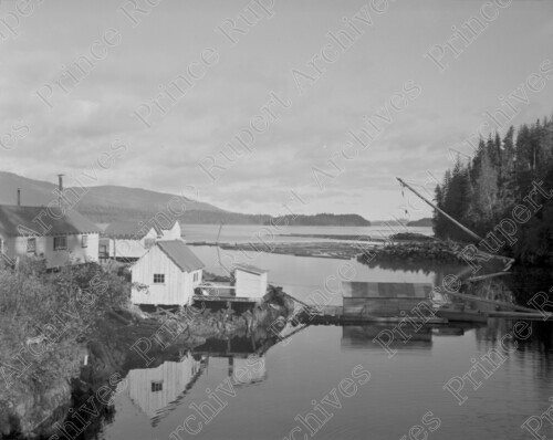 Scope & Content: Item consists of housing, buildings, log boom and equipment at the Kelly Logging. Co. camp at Shannon Bay on Haida Gwaii. Handwritten annotation on recto of copy 2 reads: "Kelly Logging Co. Shannon Bay. Q. Ch. Isl. 1950." Stamped annotation on verso of copy 2 reads: "Photo by Jack Wrathall Prince Rupert, B. C."