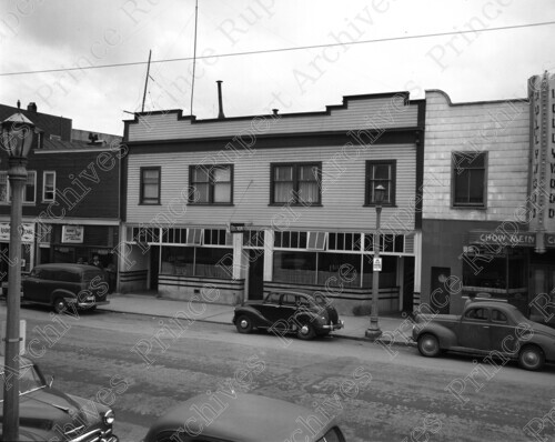 Scope & Content: Item consists of a view of the 700 block of 3rd Avenue West including the Belmont Hotel, Hollywood Cafe and Sandy's Cafe. Handwritten annotation on recto of copy 2 reads: "Belmont Hotel. 725 - 3rd. Ave. W. Prince Rupert. 1949." Stamped annotation on verso of copy 2 reads: "Photo by Jack Wrathall Prince Rupert, B. C."