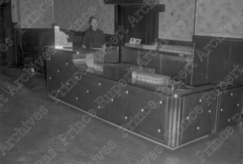 Scope & Content: Item consists of a man standing behind the bar in the Savoy Hotel on Fraser Street and 5th Street. Handwritten annotation on recto of copy 2 reads: "Savoy Hotel. 316 - 5th. St. & Fraser St. Pr. Rupert. 1949." Stamped annotation on verso of copy 2 reads: "Photo by Jack Wrathall Prince Rupert, B. C."