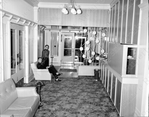 Scope & Content: Item consists of one man sitting and one standing in the lobby of the Prince Rupert Hotel. Handwritten annotation on recto of copy 2 reads: "Lobby. Pr. Rupert Hotel. 1958." Stamped annotation on verso of copy 2 reads: "Photo by Jack Wrathall Prince Rupert, B. C."