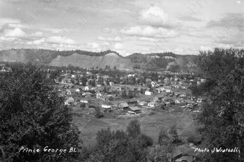 Scope & Content: Item consists of a view of a view from a hillside of downtown Prince George. Handwritten annotation on recto of copies 1 and 2 reads: "Prince George B.C. Photo J Wrathall." Handwritten annotation on recto of copy 2 reads: "1946." Stamped annotation on verso of copy 2 reads: "Photo by Jack Wrathall Prince Rupert, B. C."
