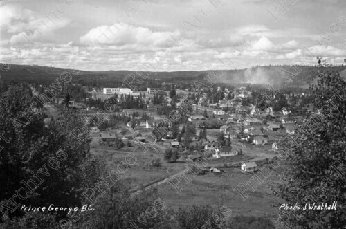 Scope & Content: Item consists of a view from a hillside of downtown Prince George. Handwritten annotation on recto of copies 1 and 2 reads: "Prince George B.C. Photo J Wrathall." Handwritten annotation on recto of copy 2 reads: "1946." Stamped annotation on verso of copy 2 reads: "Photo by Jack Wrathall Prince Rupert, B. C."