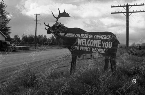 Scope & Content: Item consists of the Junior Chamber of Commerce welcome sign to Prince George on a wooden moose at the side of a dirt road. The sign reads "The Junior Chamber of Commerce Welcome You to Prince George." Handwritten annotation on recto of copy 2 reads: "1946. Entering Prince George, B.C." Stamped annotation on verso of copy 2 reads: "Photo by Jack Wrathall Prince Rupert, B. C."