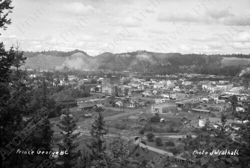 Scope & Content: Item consists of a view from a hillside of downtown Prince George. Handwritten annotation on recto of copies 1 and 2 reads: "Prince George BC. Photo J Wrathall." Handwritten annotation on recto of copy 2 reads: "Prince George, B.C. 1946." Stamped annotation on verso of copy 2 reads: "Photo by Jack Wrathall Prince Rupert, B. C."