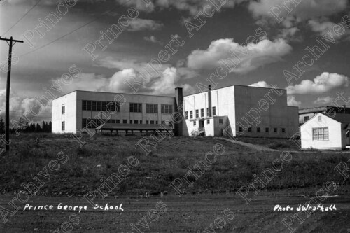 Scope & Content: Item consists of a view from below of Prince George School. Handwritten annotation on recto of copies 1 and 2 reads: "Prince George School. Photo J Wrathall." Handwritten annotation on recto of copy 2 reads: "Prince George School. 1946." Stamped annotation on verso of copy 2 reads: "Photo by Jack Wrathall Prince Rupert, B. C."