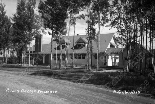 Scope & Content: Item consists of a large home in Prince George with trees out front as seen from the road. Handwritten annotation on recto of copies 1 and 2 reads: "Prince George Residence. Photo J Wrathall." Handwritten annotation on recto of copy 2 reads: "1946." Stamped annotation on verso of copy 2 reads: "Photo by Jack Wrathall Prince Rupert, B. C."