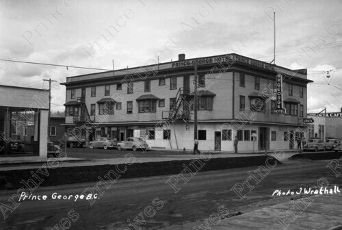 Scope & Content: Item consists of a view of the Prince George Hotel on George Street including people walking by and cars parked in front. Handwritten annotation on recto of copies 1 and 2 reads: "Prince George B.C. Photo J Wrathall." Handwritten annotation on recto of copy 2 reads: "Prince George, B.C. 1946." Stamped annotation on verso of copy 2 reads: "Photo by Jack Wrathall Prince Rupert, B. C."