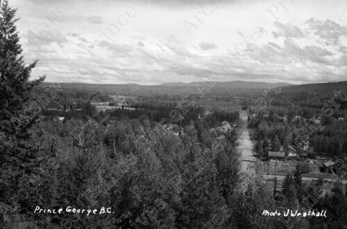 Scope & Content: Item consists of a view from a hill of homes, roads and bridge in the distance. Handwritten annotation on recto of copy 1 reads: "Prince George B.C. Photo J Wrathall." Handwritten annotation on recto of copy 2 reads: "Prince George, B.C. 1946." Stamped annotation on verso of copy 2 reads: "Photo by Jack Wrathall Prince Rupert, B. C."
