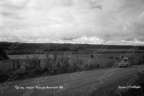 Scope & Content: Item consists of a car on the road with a boat on the top near a farm on the outskirts of Prince George. Handwritten annotation on recto of copy 1 reads: "Farm near Prince George B.C. Photo J Wrathall." Handwritten annotation on recto of copy 2 reads: "Prince George Farm. 1946." Stamped annotation on verso of copy 2 reads: "Photo by Jack Wrathall Prince Rupert, B. C."