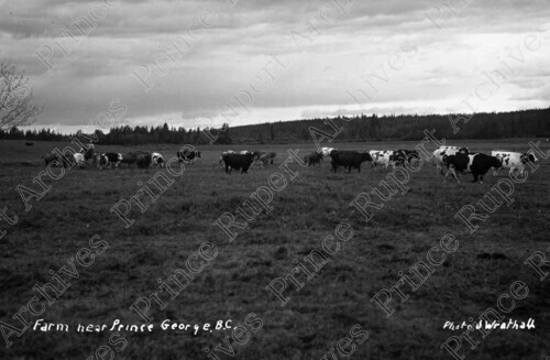 Scope & Content: Item consists of sixteen cows walking in a field alongside the river near Prince George. Handwritten annotation on recto of copy 1 reads: "Farm near Prince George, B.C. Photo J Wrathall." Handwritten annotation on recto of copy 2 reads: "Prince George, B.C. 1946." Stamped annotation on verso of copy 2 reads: "Photo by Jack Wrathall Prince Rupert, B. C."