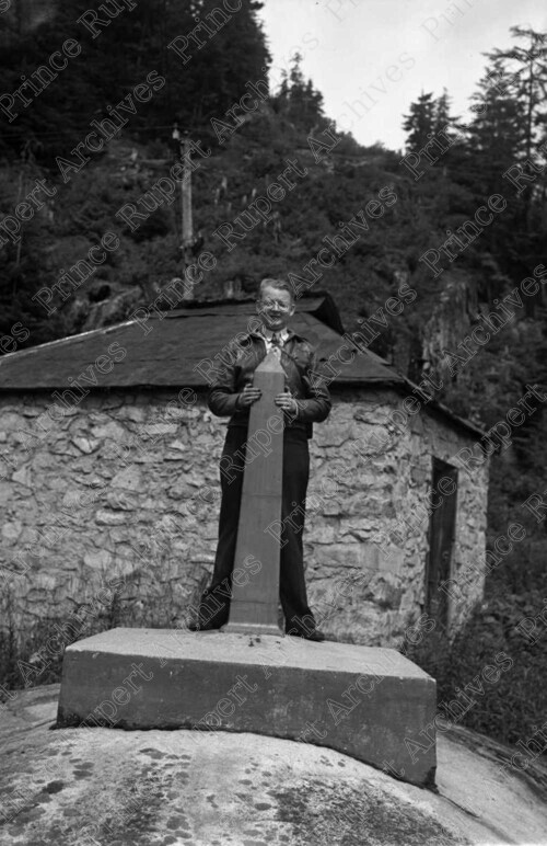 Scope & Content: Item consists of Jack Wrathall standing on a cement border marker between Alaska and Canada with a stone customs house, a mountain and trees behind him. Handwritten annotation on recto of copy 2 reads: "Jack Wrathall. 1 Ft in Alaska. 1 Ft in Canada. 1947. Hyder." Stamped annotation on verso of copy 2 reads: "Photo by Jack Wrathall Prince Rupert, B. C."