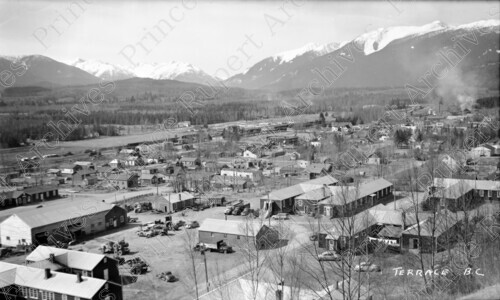 Scope & Content: Item consists of a view from a hillside of Terrace, B.C. including homes, buildings and mountains in the distance. Handwritten annotation on recto of copies 1 and 2 reads: "Terrace B. C." Handwritten annotation on recto of copy 2 reads: "Terrace, B.C. 1947." Stamped annotation on verso of copy 2 reads: "Photo by Jack Wrathall Prince Rupert, B. C."