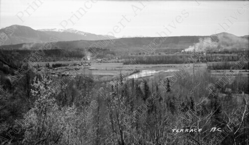 Scope & Content: Item consists of a view from a hillside of Terrace, B.C. in the distance including a river (Skeena River?) and mountains. Handwritten annotation on recto of copies 1 and 2 reads: "Terrace B.C." Handwritten annotation on recto of copy 2 reads: "Terrace, B.C. 1947." Stamped annotation on verso of copy 2 reads: "Photo by Jack Wrathall Prince Rupert, B. C."