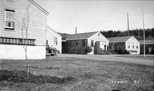 Scope & Content: Item consists of a view of three army buildings, two men standing on the front steps of one and two vehicles. Handwritten annotation on recto of copies 1 and 2 reads: "Terrace B.C." Handwritten annotation on recto of copy 2 reads: "Army Bldg. Terrace, B.C. 1947." Stamped annotation on verso of copy 2 reads: "Photo by Jack Wrathall Prince Rupert, B. C."