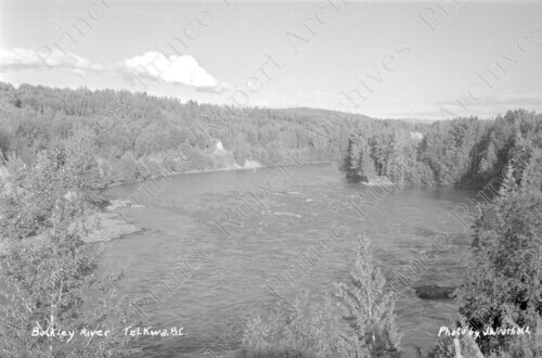 Scope & Content: Item consists of an overhead view of the Bulkley River. Handwritten annotation on recto of copy 2 reads: "Bulkley River. At Telkwa, B.C. 1960. W.W.W." Stamped annotation on verso of copy 2 reads: "Photo by Jack Wrathall Prince Rupert, B. C."