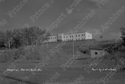 Scope & Content: Item consists of a view from below of the Vanderhoof Hospital, hydro poles and small building down below. Handwritten annotation on recto of copy 1 reads: "Hospital Vanderhoof BC. Photo by J Wrathall." Handwritten annotation on recto of copy 2 reads: "Vanderhoof Hospital. 1949." Stamped annotation on verso of copy 2 reads: "Photo by Jack Wrathall Prince Rupert, B. C."