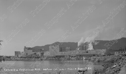 Scope & Content: Item consists of the Columbia Cellulose Pulp Mill at Watson Island nearly completed from the waters surrounding the Pulp Mill. Handwritten annotation on recto of copies 1, 2 and 3 reads: "Columbia Cellulose Mill, Watson Isl. near Prince Rupert BC." Handwritten annotation on recto of copy 3 reads: "Cellulose Plant Under Construction. 1950." Stamped annotation on verso of copies 2 and 3 reads; "Photo by Jack Wrathall Prince Rupert, B. C."