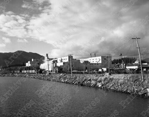 Scope & Content: Item consists of a view of the Columbia Cellulose Pulp Mill at Watson Island from the waters surrounding the Pulp Mill. The view includes buildings, a train with cars and a water tower above. Handwritten annotation on recto of copy 2 reads: "Cellenese [sic] Plant. 1951." Handwritten annotation on recto of copy 3 reads: "Col. Cellulose Mill. Watson Isl. 1951." Stamped annotation on verso of copies 2 and 3 reads: "Photo by Jack Wrathall Prince Rupert, B. C."