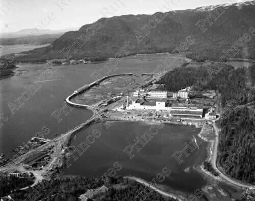 Scope & Content: Item depicts an aerial view of the Columbia Cellulose Pulp Mill at Watson Island, CN railway tracks, Bilmor in the distance and surrounding water and mountains. Handwritten annotation on recto of copy 2 reads: "Col. Cellulose Mill. Watson Isl. Bilmore [sic] Background. 1952." Stamped annotation on verso of copy 2 reads: "Photo by Jack Wrathall Prince Rupert, B. C."