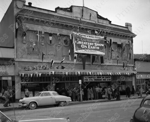 Scope & Content: Item consists of people lined up in front of the Capitol Theatre on 3rd Avenue West to see "Cecil B. DeMille's Greatest Show on Earth." A Union Steamship office and the Capitol Shop can be seen in the Theatre on the left. Handwritten annotation on recto of copy 2 reads: "Capitol Theatre. 500 Blk. 3rd. Ave. W. June 24 - 1952." Stamped annotation on verso of copy 2 reads: "Photo by Jack Wrathall Prince Rupert, B. C."
