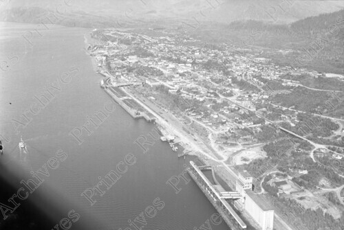Scope & Content: Item consists of an aerial view of the Canadian Government Grain Elevator, Ocean Dock, Prince Rupert Drydock and Shipyard and downtown. Handwritten annotation on recto of copy 2 reads: "1948." Stamped annotation on verso of copy 2 reads: "Photo by Jack Wrathall Prince Rupert, B. C."