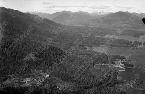 Scope & Content: Item depicts an aerial view of Barrett Fort, and lookout, and Bilmore Sawmill along CN Railway lines on Kaien Island. Handwritten annotation on recto of copies 3 and 4 reads: "Barret [sic]. Bilmore Sawmill. Kaien Isl. 1946. C.N. Rail." Stamped annotation on verso of copies 3 and 4 reads: "Photo by Jack Wrathall Prince Rupert, B. C."