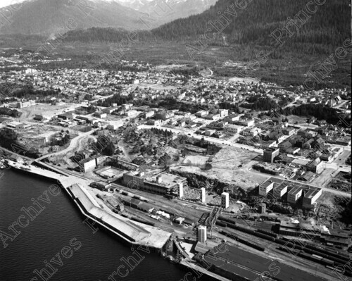 Scope & Content: Item consists of an aerial view of Prince Rupert from waterfront to height of the city. The view includes the Elizabeth Apartments on 1st Avenue West and the Prince Rupert Courthouse on Market Place. Handwritten annotation on recto of copy 4 reads: "1948 CNR Wharf. U.S. Army Warehouse." Stamped annotation on verso of copies 2, 3 and 4 reads: "Photo by Jack Wrathall Prince Rupert, B. C."