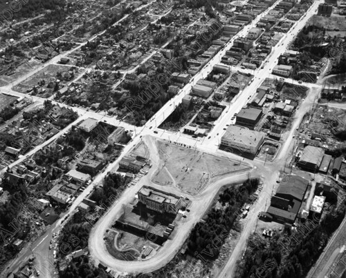 Title: Aerial View of 1st Ave to 6th Ave and the Prince Rupert Courthouse at Prince Rupert, B.C. in 1950