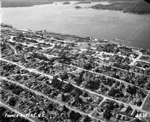 Scope & Content: Item consists of an aerial view of 1st Avenue to 7th Avenue West, an edge of the Canadian Government Grain Elevator and the Ocean Dock. Handwritten annotation on recto reads: "Prince Rupert, B.C. J.R.W."