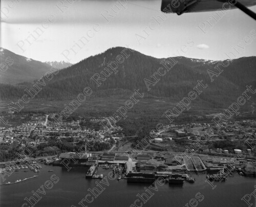 Scope & Content: Item consists of an aerial of the Prince Rupert Drydock and Shipyard, Rushbrook floats, Hays Creek Bridge Sections 6 to 8 and mountains.
