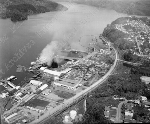 Scope & Content: Item depicts an aerial view of the waterfront from Rushbrook Floats showing Overlook Street and 4th Avenue East, the old drydock site, the sawmill, oil tanks, fuel dock, Malkin's Food Distributors, and other businesses along George Hills Way and Cow Bay Road. Handwritten annotation on recto of copy 2 reads: "P. Rupert Saw Mill. Old Drydock Site. Geo Hill's Way." Handwritten annotation on recto of copy 3 reads: "1961. Saw Mill. Over Look." Stamped annotation on verso of copies 2, 3 and 4 reads: "Photo by Jack Wrathall Prince Rupert, B. C."