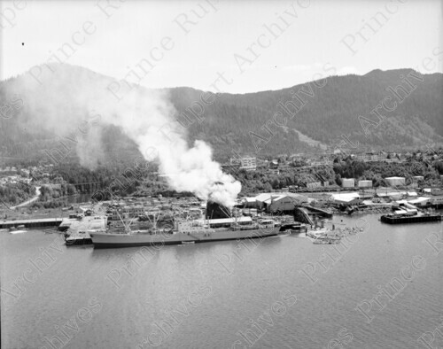 Scope & Content: Item consists of an aerial view of the Prince Rupert Sawmill, the ship "Hermion" at the dock and Imperial Oil tanks. Handwritten annotation on recto of copy 4 reads: "Pr. Rupert Sawmill. 1961." Stamped annotation on verso of copies 2, 3 and 4 reads: "Photo by Jack Wrathall Prince Rupert, B. C."