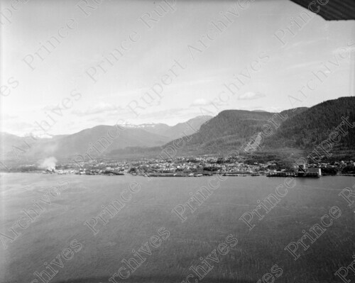 Scope & Content: Item consists of an aerial view of the Prince Rupert waterfront including the Canadian Government Grain Elevator, government wharf, mountains and harbour. Handwritten annotation on recto of copy 2 reads: "1963."