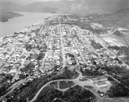 Scope & Content: Item consists of an aerial view from 3rd Avenue to 9th Avenue. The view includes Roosevelt Park. Handwritten annotation on recto of copy 4 reads: "3rd. Ave. to - 9th Ave. Roosevelt School. Summit. Ave. Pr. Rupert. 1963." Stamped annotation on verso of copies 2 and 4 reads: "Photo by Jack Wrathall Prince Rupert, B. C."