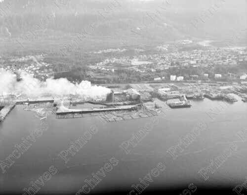 Scope & Content: Item consists of an aerial view of a sawmill at the Prince Rupert Drydock and Shipyard site with Sections 6 to 9 and mountains in the background. Stamped annotation on verso of copy 2 reads: "Photo by Jack Wrathall Prince Rupert, B. C. 1965."