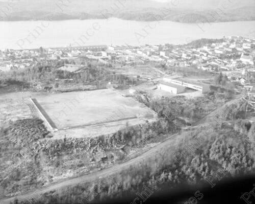 Title: Aerial View of Roosevelt Park, Reservoir, Ball Grounds and Roosevelt School at Prince Rupert, B.C. in 1965