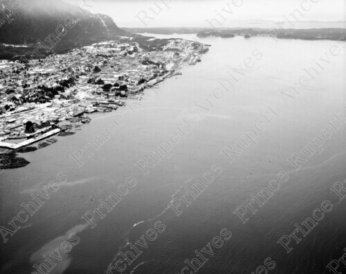Scope & Content: Item consists of an aerial view of the Prince Rupert waterfront including Cow Bay, the Ocean Dock and Canadian Government Grain Elevator. Mount Hays can be seen on the left. Handwritten annotation on recto of copy 2 reads: "1969. Saw Mill to Elevator." Handwritten annotation on recto of copy 3 reads: "P. Rupert Showing Waterfront." Stamped annotation on verso of copy 3 reads: "Photo by Jack Wrathall Prince Rupert, B. C."