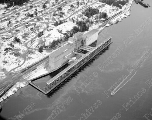 Scope & Content: Item consists of an aerial view of the Canadian Government Grain Elevator, CN railway tracks and part of section 2 including houses in the winter. Handwritten annotation on recto of copy 2 reads: "P. Rupert Elevator." Stamped annotation on verso of copy 2 reads: "Photo by Jack Wrathall Prince Rupert, B. C." Handwritten annotation on recto of copy 3 reads: "1969. Grain Elevator."