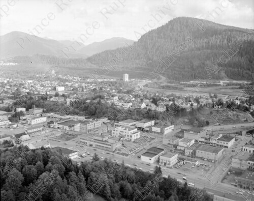Title: Aerial View of 2nd to 5th Street, 2nd Avenue, 3rd Avenue Post Office and City Hall at Prince Rupert, B.C. in 1970